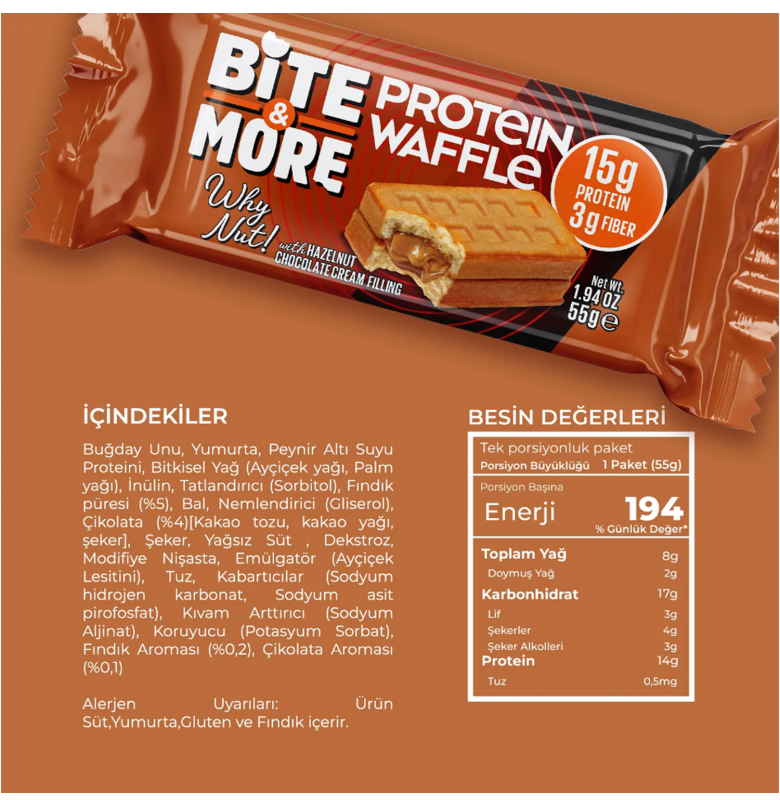 Bite & More Protein Waffle Fındık 12 Adet x 55 Gram
